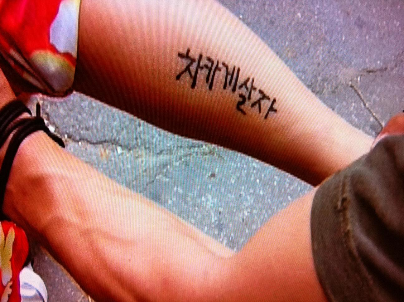 本来なら「착하게 살자」(善良に生きよう)が正しいつづり。